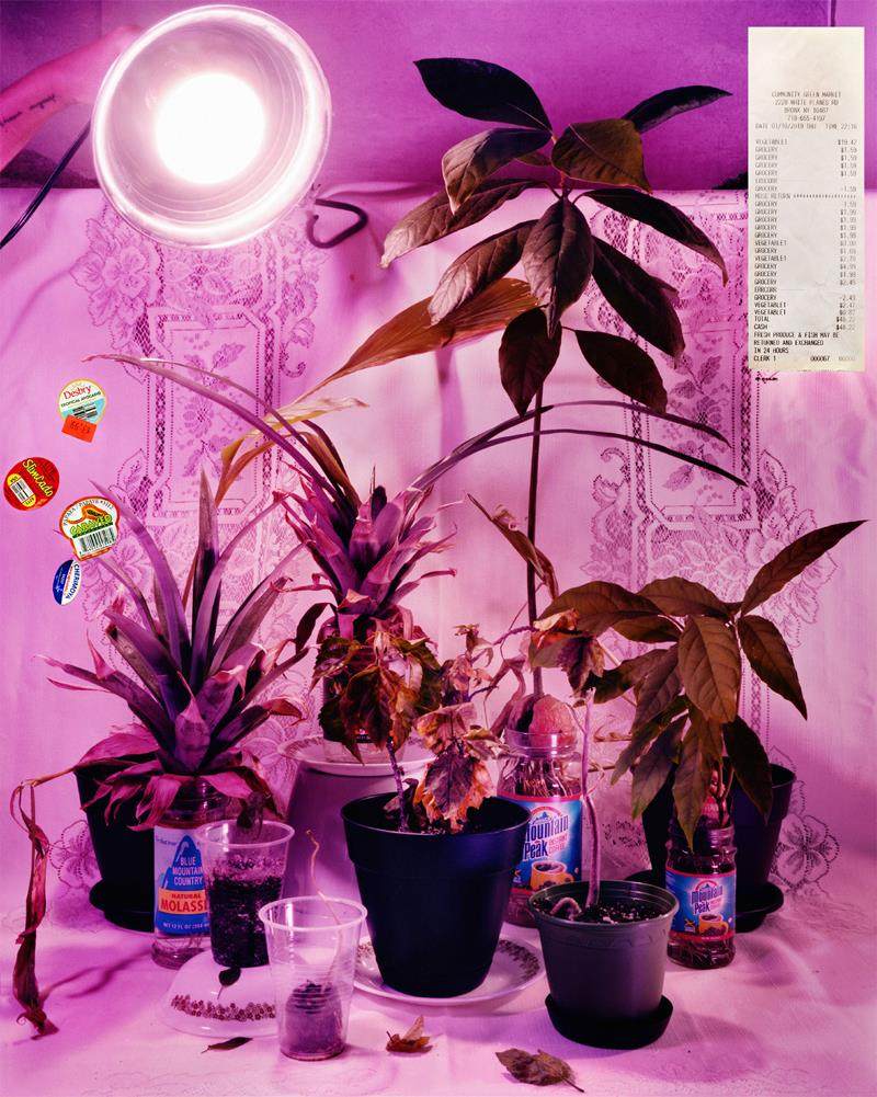 在《建构》系列中,博科斯利用家中祖传和承载文化记忆的物件,来打造置景和静物。加勒比地区的本地植物对美国而言是“外来物种”,它们在人造光下生长,如同移民人口的替身。对在异国他乡生存而言,为了适应环境而采取的对策至关重要。艺术家在图像上拼贴了产品标签和收据,暗示资本社会痴迷于将身份商品化。契约劳工的档案图片反映了加勒比地区的殖民历史,而家庭照片则诉说着另一段解放的历史。曾有谬论将加勒比地区视为异国殖民天堂,博科斯通过故意暴露摄影工作室的人工布景,讨论人在强化此种谬论中曾经扮演的历史角色。