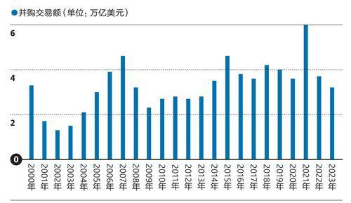 根据贝恩公司2024年2月底发布的第六次年度《全球并购市场报告》(以下简称《报告》),2023年,全球并购市场的总体交易规模下跌15%,降至3.2万亿美元,是10年来的最低点。