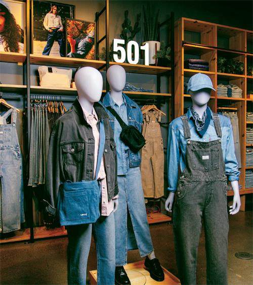 在美国旧金山市场街的李维斯(Levi's)门店里,人体模特从头到脚都穿着李维斯标志性的牛仔装—黑色牛仔连身裤搭配浅蓝色长袖牛仔衬衫,再配上牛仔帽。另一个模特则斜挎牛仔包。店里有一整墙的蓝色牛仔夹克,顾客可以自行选择装扮成嬉皮士、农场主或是摇滚明星。