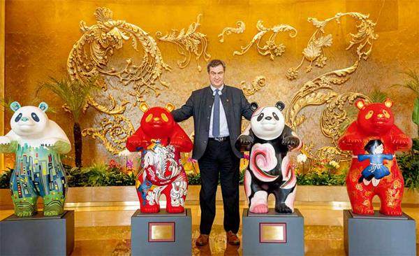 3月25日,在四川成都,索德爾与4个彩色熊猫雕像合影。