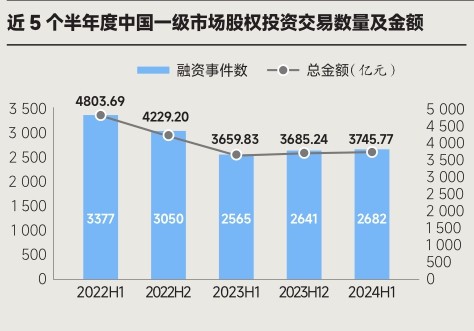 相比较整个 2023 年,今年的资本市场呈现出略微回暖的趋势。IT 桔子数据显示,2024 年上半年,国内—级市场私募股权融资事件数有 2 682 起,环比增长1.56%,同比增长 4.56%;估算总投资额约为3 745.77 亿元,环比增长 1.64%,同比增长 2.35%。