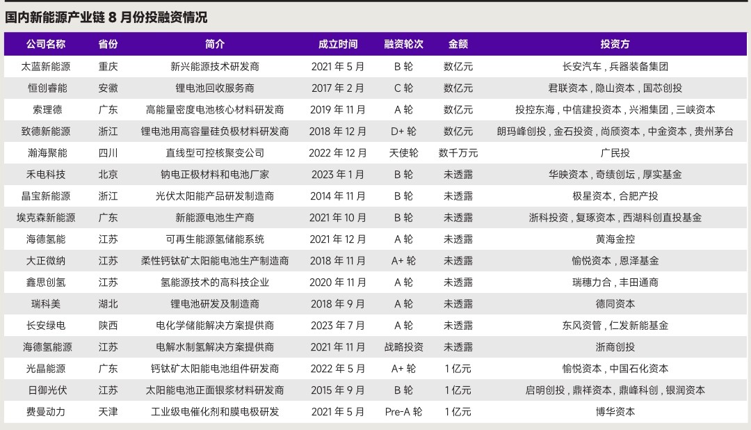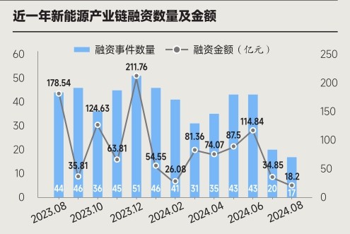 今年 7 月和 8 月的投资事件分别为 20 起和 17 起,环比下降 53.49%(有数据收录延迟的影响)。在融资金额方面,近一年来新能源产业链的融资金额波动幅度较大,其中 2023 年 12 月的融资金额达到 211.76 亿元,为近一年来的最高值。