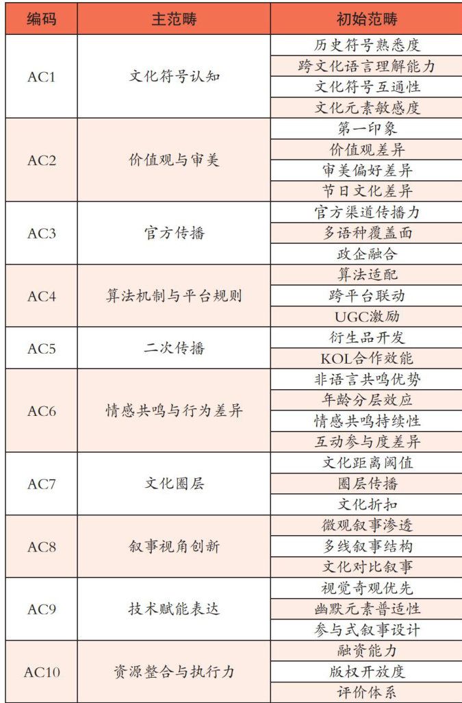 通过扎根理论分析,在10个主范畴的基础上,提炼出文化共鸣、传播渠道、受众接受度、叙事策略、资源整合等5个核心影响因素,为针对性地分析提升策略奠定基础。