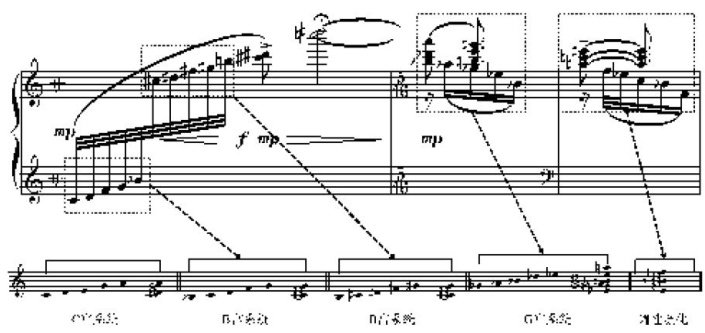 整部作品在音高组织手法上,采用了五声性调式与泛调性相结合的方式。开篇第1小节处的三十二分音符等时值上行音型由前后两组五声调式音阶以间隔小九度音程的距离并列开来,前者为B宫系统的C商调式五声音阶,后者为B宫系统 *C 商调式五声音阶。这两组五声音阶作为核心音型,包含了一种不常见的“中西融合”手段,即两者之间的半音(八度等同原则)纵向和声距离为材料的衍变、拓展提供了巨大的可能。
