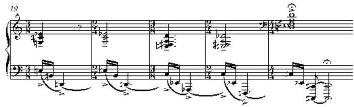 事实上,作曲家在该作品中就是运用(并进一步发展)了这种“半音化游移"特征的手法。随着音乐的发展,附加二度音程的三度结构和弦的叠加程度愈演愈烈,最终导致五声音阶调式系统的模糊、泛化,甚至彻底消解。第1小节中,两个五声音阶纵向叠置后结构尚清晰可辨。而第2小节则引入复杂的纵向和弦叠置,尽管保留了 bG 宫调式的痕迹,但由于和声进行中大量出现的附加二度音程,整体不协和性显著增强。至第3小节,由于特征音的模糊和缺失,其内部已经无法准确判断所属调性体系,此处较为合理的解释是a小三和弦附加了B、E、F三个二度音程。此处音乐已脱离传统调性系统,转向以附加音程构建和声张力的新途径。