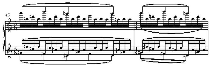 受此种音高组织特征的影响,该作品发展出了愈加精妙复杂的文本样态。除上例中类似第1小节的等时值、宽音域升降形态和第2一3小节以“先抑后扬"的纵向柱式和弦进行搭配下方声部的横向快速流动音型这两种情况之外,值得关注的还有谱例2和谱例3所展示的两个片段