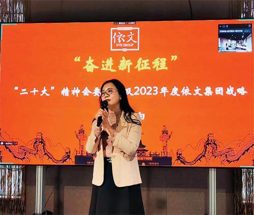 依文集团董事长、创始人、依文集团党支部书记夏华发表讲话,她总结了依文集团过去28年来各业务部门经营成果,同时也对未来的发展方向进行了部署。会上,夏华同志表示:在研读学习二十大报告后我无比激动,在党的领导下,依文集团始终跟随时代的脉搏,一路前行。在未来,依文集团继续将企业发展目标和国家战略深度融合,聚焦行业需求,以二十大精神为基调为目标发展集团,围绕“时尚、国潮、数字、科技”中心,加快研发的步伐、创新的步伐,敢于挑战科技的前沿,要和产业界一起面对各种痛点和难点的问题,并推进产业界深层次的融合,为我们的制造强国、网络强国、数字中国的建设注入新的强大动能。