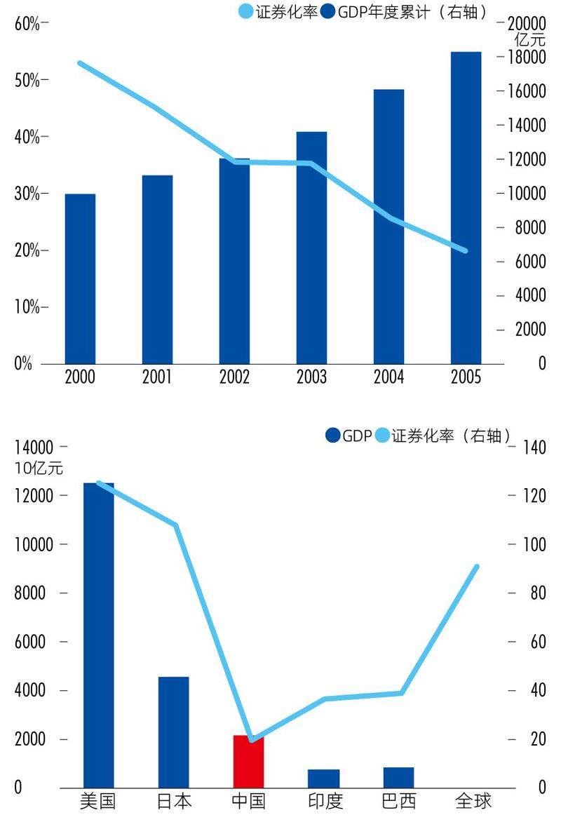 2006年6月,张忆东初出茅庐,撰写了《和平崛起的大国,众望所归的牛市》。在这篇报告里,张忆东观察到了两个尖锐的矛盾:其一,中国GDP连年上涨,但证券化率(资本市场市值/GDP)却在不断下降;其二,中国证券化率已低至20%,不仅远远低于美国、日本等发达国家,甚至不及巴西、印度等新兴市场,也远低于全球平均水平(图1)。