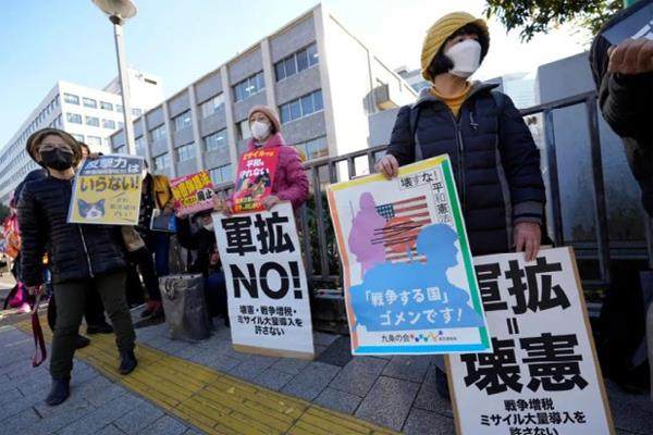 三份文件通过当天,数百名市民在东京的首相官邸前集会,高举“不可解禁反击能力”“反对安保三文件”等标示牌抗议。