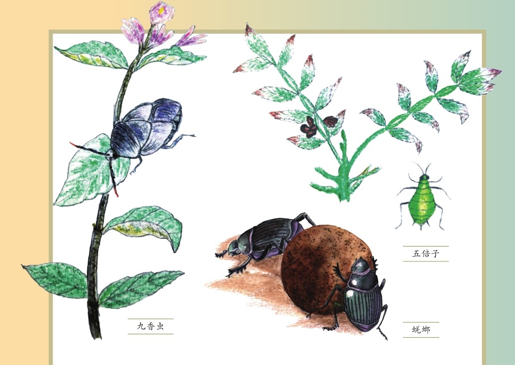南北朝陶弘景在《神农本草经》的基础上增补了白蜡、原蚕蛾、土蜂、大黄蜂、芫菁、葛上亭长、蜻蛉、桑蠹虫和夜行虫9种药用昆虫,并进一步描述了蚱蝉、葛上亭长、蛴螬等昆虫的形态特征与生物学特性,形成了《名医别录》和《本草经集注》。