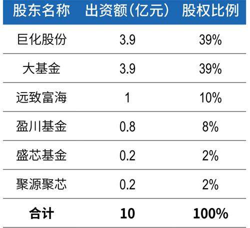 2017年12月25日,巨化股份联合大基金、远致富海、盈川基金、盛芯基金、聚源聚芯等5家外部机构发起设立中巨芯。其中,巨化股份、大基金均出资3.9亿元,各自占有39%的股份,为并列第一大股东(表1)。4天后,中巨芯即收到了股东们10亿元启动资金。