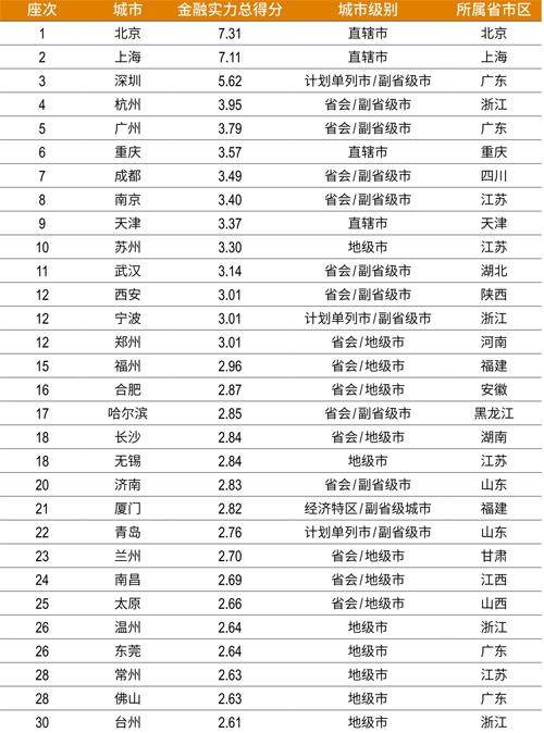 第一梯队:总得分≧5分,包括北京、上海、深圳3市,其金融实力强劲,为全国性金融中心。