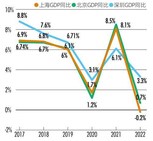 2022年二季度,上海由于疫情冲击,创下了改革开放以来的首次经济负增长,GDP被北京赶超,这也是北京历史上首次对上海的季度赶超。不过2022年前三季度,上海以3.09万亿元的GDP总量迅速实现了反超,稳住了经济总量第一的位置,展现了经济的韧性。2022年,上海以4.47万亿元的GDP总量收官,高于北京的4.16万亿元,稳住了“中国经济第一城”地位。