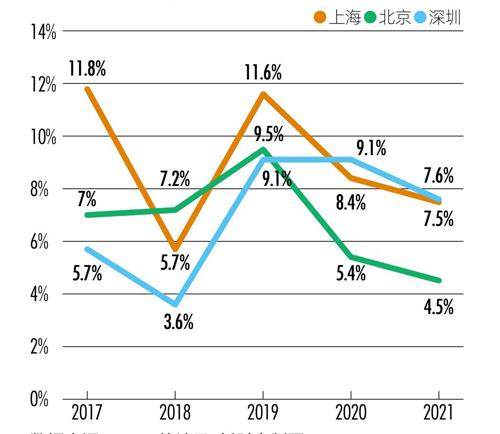 与GDP在2021年经历挫折相比,深圳金融业增加值则逆势而上。对比来看,2019年之前,深圳金融业增加值的增速均要低于北京、上海。2019年,深圳金融业增加值同比增长9.1%,2020和2021年的增速则均高于北京和上海(图3)。