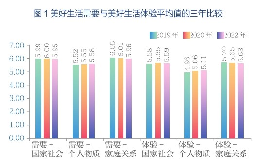 2022年是极不平凡的一年,是人们在疫情笼罩下艰难生活的一年,正常的生活秩序被打破,工作、学习、旅行、就业、医疗都充满了不确定性。在国际、国内不确定难预料因素增多的情况下,2022年我国社会心态有什么特点?与2019年、2020年相比,我国社会心态呈现怎样的变化趋势?本文将通过2019年、2020年和2022年三年社会心态调查的对比,来分析社会心态主要指标的变化,如美好生活需要和美好生活体验,幸福感、安全感、社会支持、社会压力、社会公平感等。本文的社会心态数据来源于中国社会科学院社会学研究所社会心理研究中心在2019、2020、2022年开展的中国社会心态调查(Social Mentality Survey):2019年的调查包含有效问卷9621份,其中,男性占44.0%,女性占56.0%,平均年龄41.51±13.94岁;2020年的调查包含有效问卷10195份,其中,男性占43.3%,女性占56.7%,平均年龄41.61±13.02岁;2022年的调查包含有效问卷6168份,其中,男性占43.35%,女性占56.65%,平均年龄42.68±12.16岁。