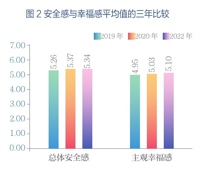第二,总体安全感略有下降,主观幸福感呈逐年递增趋势,但仍有两成民众幸福感偏低。如图2所示,2019、2020、2022年民众总体安全感处于较高水平(Ms≥ 5.26),约7成以上民众认为社会总体是安全的(占比 ≥ 77.81%)。认为2022年社会总体安全的民众占比比2019、2020年分别提升了8.86和3.96个百分点;不过,2022年民众总体安全感得分比2020年略低,表明近年来有更多的民众认可社会总体是安全的,但总体安全感的程度则无明显提升。其中,2022年环境安全感增幅较大,认可环境安全的民众占比同2019、2020年相比分别提升了10.46和2.54个百分点。其次,2022年人身安全感、交通安全感、劳动安全感相比2019、2020年有所提升,财产安全感、医疗药品安全感、食品安全感相比2019年有所提升,但比2020年略有下降。最后,2022年个人信息安全感与2019年持平,但比2020年显著下降,认可个人信息安全的民众占比与2019年基本一致,但比2020年下降了3.72个百分点。可见,与往年相比,各维度安全感仍有一定程度的提升空间,尤其应着力维护和提升民众个人信息安全感。在幸福感方面,2019、2020、2022年民众主观幸福感均处于中等偏上水平(Ms ≥ 4.95),六成以上民众主观幸福感较高(占比 ≥ 68.69%)。2022年民众主观幸福感显著高于2019年和2020年。并且,2022年体验到较高程度主观幸福感的人数占比比2019年增加9.86个百分点,比2020年增加7.17个百分点。不过,2022年仍有两成多民众主观幸福感处于中等偏下水平。
