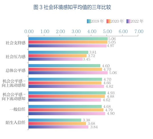 第三,社会环境感知方面,社会支持感略有下降,社会压力感除物价外整体有所下降,社会公平感和社会信任逐年上升(见图3)。在社会支持感方面,2019、2020、2022年民众社会支持感均处于中等偏上水平(Ms ≥ 4.97),七成以上民众报告能够获得社会支持(占比 ≥ 75.37 %)。其中,报告能够获得家人支持的比例最高(占比 ≥ 87.81%),其次是朋友(占比 ≥74.42%)、政府和机关(占比 ≥ 54.73%)、社会组织(占比 ≥ 49.01%)。