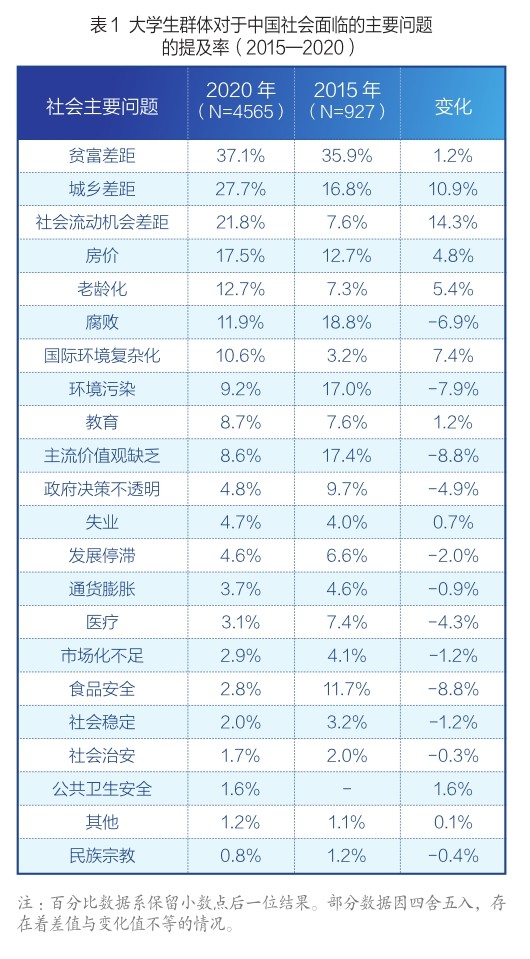 “三距”:貧富差距、城乡差距、社会流动机会差距。这三者是大学生最关注的社会主要问题。根据2020年调查结果,贫富差距(37.1%)、城乡差距(27.7%)与社会流动机会差距(21.8%)是大学生群体提及率最高的社会主要问题。相比于2015年的调查结果,2020年的调查结果显示,认为贫富差距是社会主要问题的大学生比例仍然居于首位,且比例小幅上升;城乡差距和社会流动机会差距提及率大幅上升,分别升高了10.9个百分点和14.3个百分点。