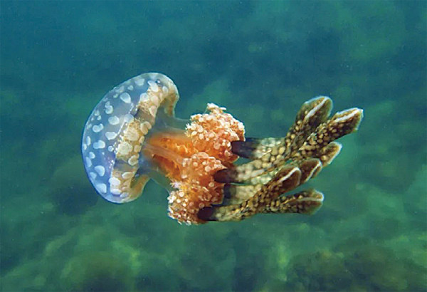 鲎的形状像一只铁铲,从正面看来又像一顶钢盔。那一条尾巴就恰如一把刺刀,三棱形的尾巴上有尖刺。它能翘起尾巴来鞭人,给它们刷着一下就要流血。它的一切器官都隐藏在钢盔似的硬壳底下,壳比蟹壳还要坚硬,四周有刺,保护得非常周密。香港新界的乡下人将鲎壳用来车水,或者用作舀水的工具。