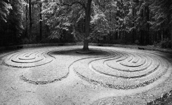 古日耳曼的草坪迷宫(rasenlabyrinth)和斯堪的纳维亚地区的石阵(trojaburg)都属于古代自然崇拜仪式的一部分。在汉诺威的艾伦里德(Eilenriede)城市森林中,还存有一处古日耳曼草坪迷宫遗迹。迷宫的正中心挺立着一棵象征和平与安宁的菩提树,人们沿着迷宫的圆形路径跳舞,逐渐进入迷宫中心,恰似与大自然合一的过程。瑞典海边常见的石阵呈单一螺旋状,没有死路与错道。当地渔民相信,出海捕鱼前往那里走上一回,厄运就会被困在石阵里,人就能平安远航了。