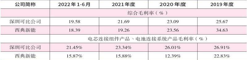 据西典新能招股书披露,为了进入宁德时代的供应商体系,西典新能采取了较具竞争力的报价策略。在西典新能披露的可比公司中,深圳的可比公司销售的电芯连接组件产品与西典新能的电池连接系统产品功能相同,主要客户亦为宁德时代,属于同类产品。深圳可比公司在2016年开始向宁德时代批量供应电芯连接组件,作为后来者,西典新能以相对较低的毛利率水平入围宁德时代供应商体系,导致电池连接系统毛利率低于深圳可比公司。与此同时,西典新能的综合毛利率(2021年~2022年上半年)也低于深圳可比公司。(见表1)