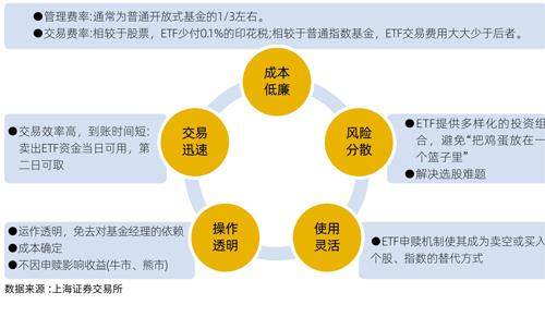 股票型ETF既有指数基金的简单透明,还兼具了股票的交易和流通特性,交易便捷,能帮助投资者抓住盘中上涨的机会。