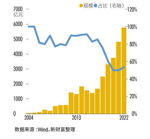 值得注意的是,2004至2017年,规模指数ETF资产规模缓慢增长,但占股票型ETF比重维持在80%以上,主体地位明显。2018年起,该比重不断下降至2022年的53%(图3)。