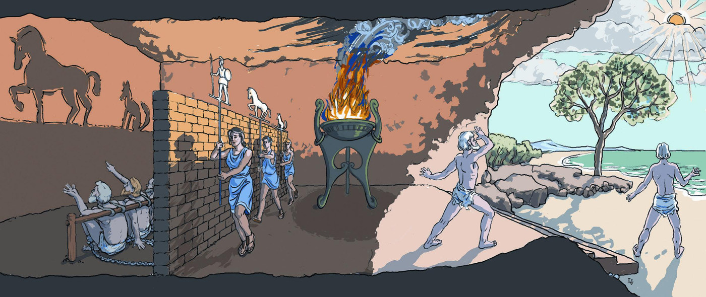 柏拉图在《理想国》中讲到一个关于洞穴的神话故事。他设想有这样一个洞穴,它有一条长长的通向地面的通道,和洞穴等宽的光线能照到洞底。有一些人从小就住在这个洞穴里,他们的脖子和腿脚被捆住了,无法走动,也无法扭头去看,只能朝前看到洞穴的后壁。他们背后远处高的地方有些东西在燃烧着发出火光。火光跟这些被囚禁的人之间有一堵矮墙,沿着这堵墙有一条道路,矮墙的作用就好比木偶戏演员和观众之间的屏障,有人举着用木头、石块或者别的材料制成的假人或假的动物从矮墙后经过。假设其中有囚徒被释放出来,在他眼睛直视光亮时一定非常痛苦。此时如果有人告诉他,往日他所见到的东西都是虚假的,现在看到的才是真实的事物,他会做何反应?如果让他重回到洞穴之中,他是否会觉得黑暗?