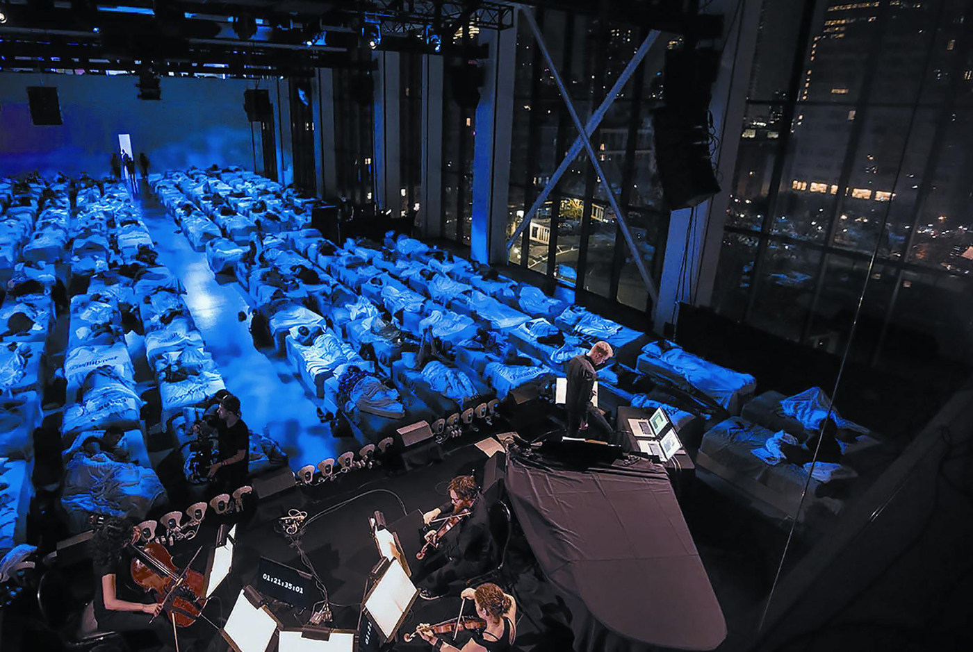 这是英国作曲家马克思·里希特(Max Richter)《睡眠》(Sleep)的演出现场。灵感来自其2015年发布的同名概念专辑,里希特想要探索人类入睡后的听觉意识,并解码梦境和人类听觉感知的神秘关联。2019年,他把这些“躺听”现场制作成同名纪录片,当作献给“入睡者”的礼物。
