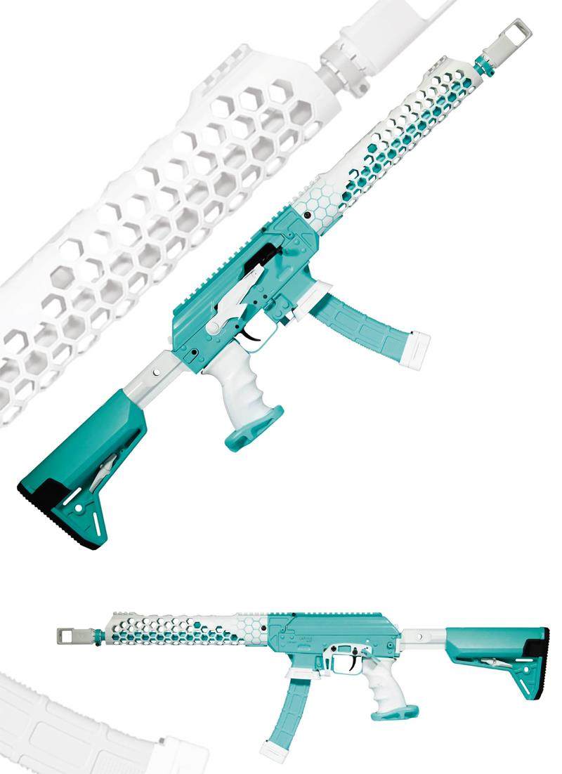 该枪是在PP-19-01 Vityaz 冲锋枪基础上推出的客户定制版,外形颇现代,发射9mm巴拉贝鲁姆枪弹。比较特别的是,其护手、小握把涂装为白色,枪管、机匣及枪托涂装为绿色,配色清新脱俗。