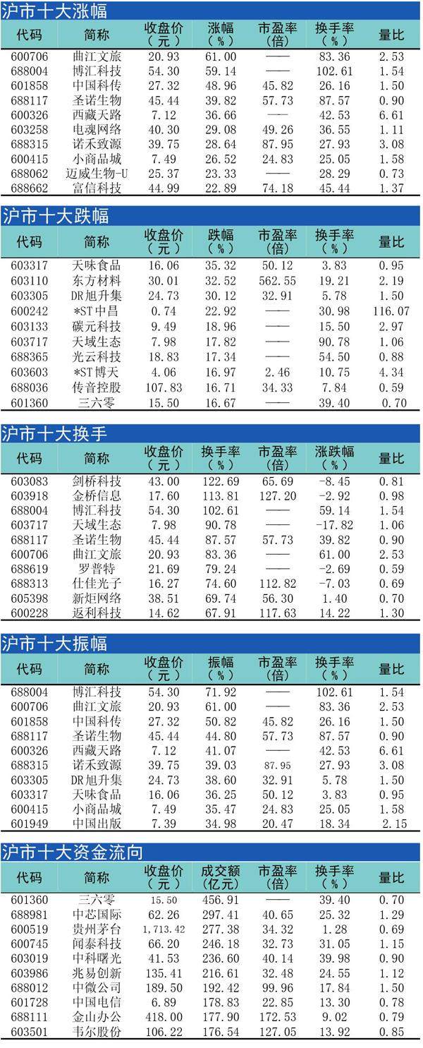 十大涨跌幅、换手、振幅、资金流向