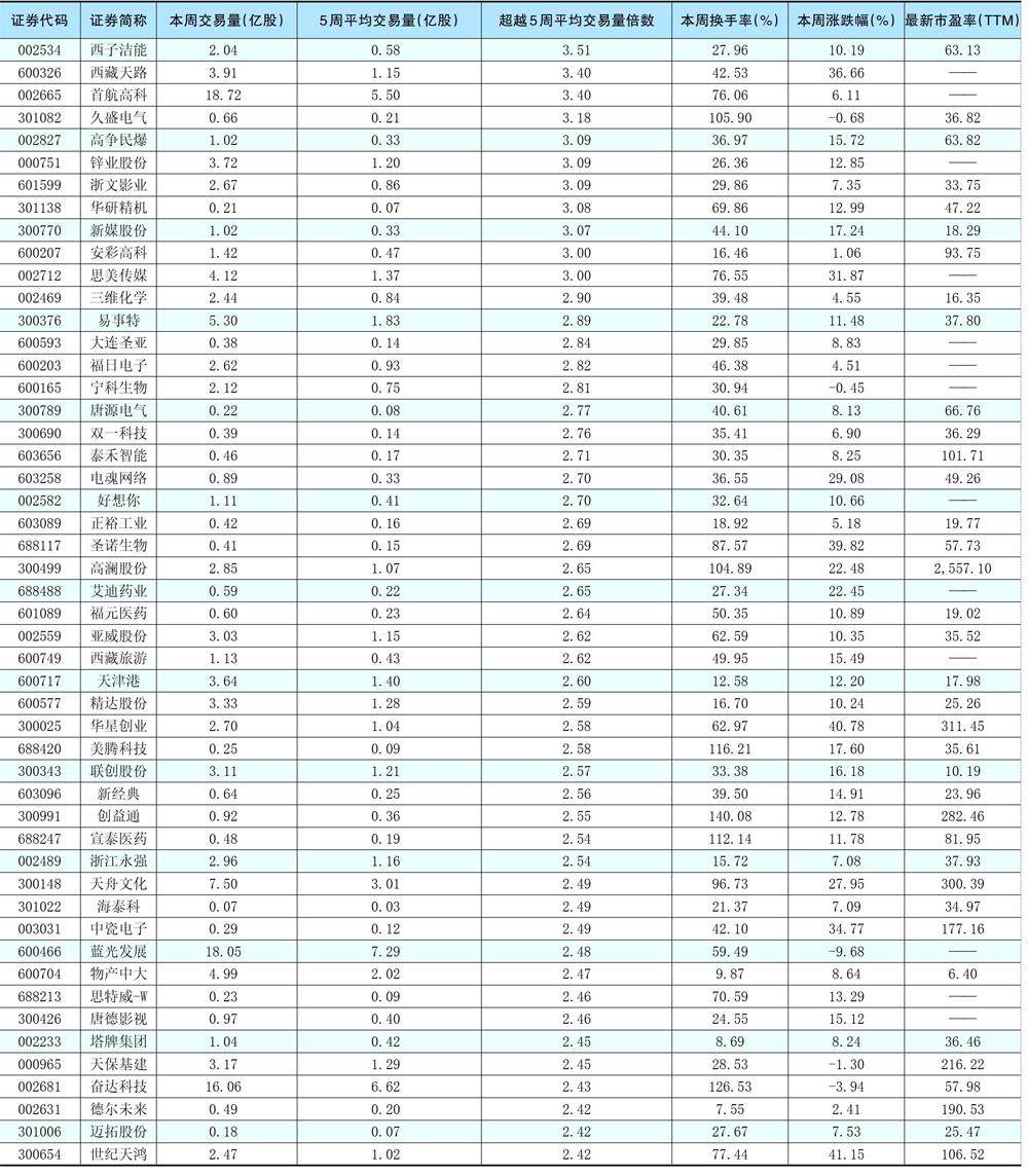 一周成交量大幅增加前50只个股
