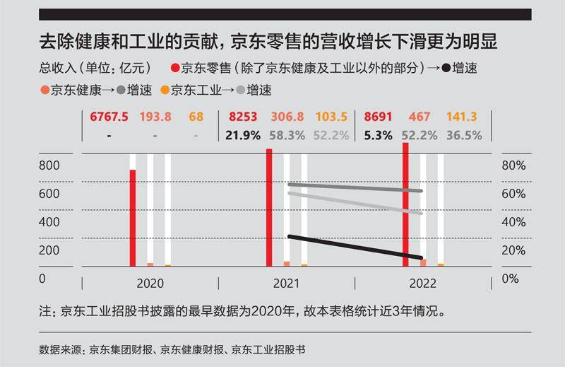 今年刚好是京东创业20周年,目前京东拥有5家上市公司—京东集团、京东物流、京东健康、达达集团、德邦股份,以及两个拟于港交所上市的业务单元:京东产发和京东工业。过去三年,新冠疫情持续影响社会经济大环境,很多企业都活得很难,但活跃于“保供”一线的京东,2020年实现的营收增速反而好于疫情前的水平,2021年继续保持着20%以上的营收增长率。另外值得注意的是,2020年至2021年京东集团、京东健康和京东物流陆续在港交所IPO,分别实现净募资313亿元、257亿元和229亿元。这些数字都让京东在2022年出现的业绩滑坡,显得更加突兀。
