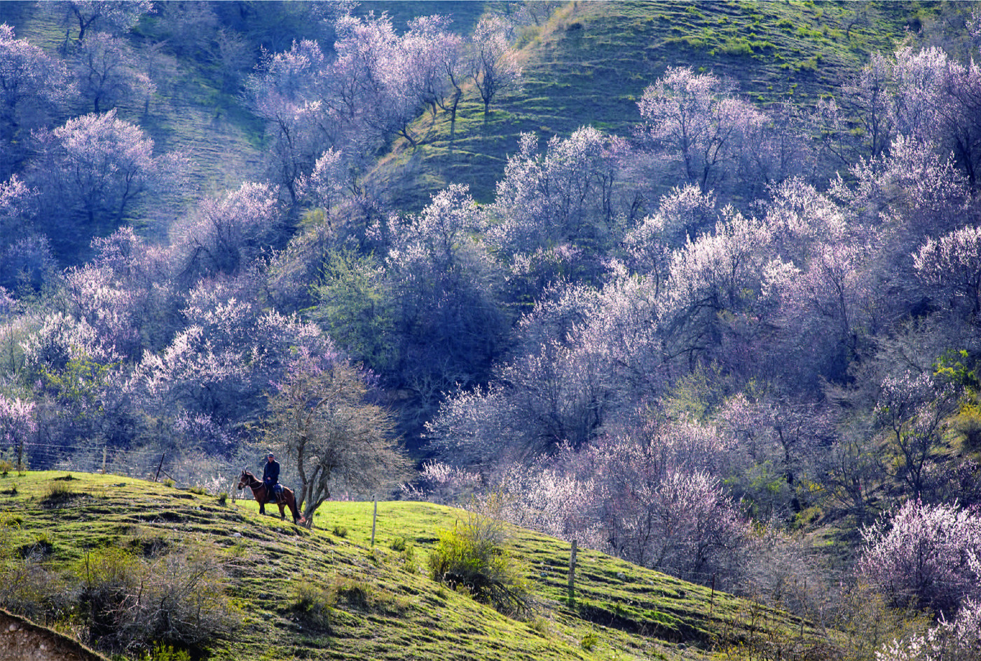 2023年4月13日,新疆伊犁哈萨克自治州,位于天山脚下的霍城大西沟草原绿草如茵,漫山遍野的杏花开放,草原春日美不胜收。