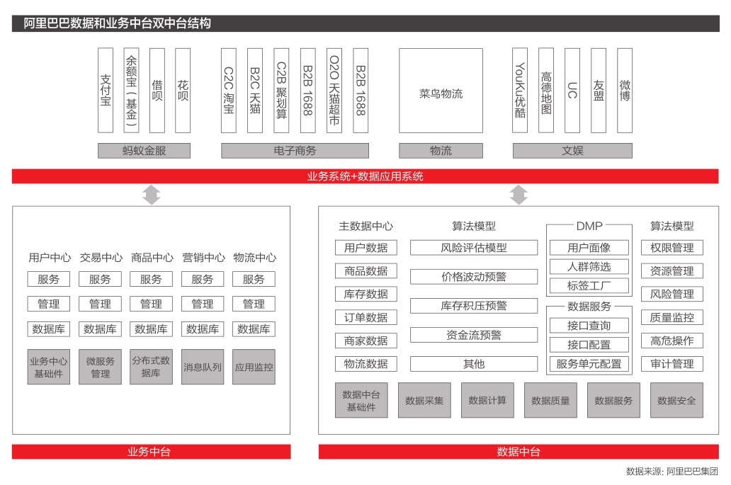 沿着这个思路,阿里逐步将搜索事业部、共享业务平台、数据技术、产品部拆出来,一并组成了“中台事业群”。中台发展到后期,会员、营销、交易等通用链路早已成为一套中台服务体系,前台业务在需要时就能快速启用。