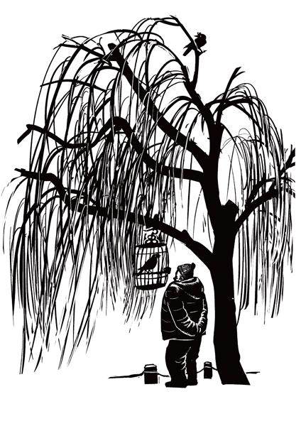一楼的老王,孤身一人,无儿无女,是个鸟儿迷。老王养了许多漂亮的鸟儿,有虎皮鹦鹉、牡丹鹦鹉、画眉、鸽子等。不过,老王最钟爱的鸟,却是一只黑不溜秋的八哥。八哥的外表,实在比不上鹦鹉,两只细长的爪子,头上还掉了些羽毛,斑斑驳驳的;但八哥能说话,且能模仿几种版本的声音,苍老的、稚气的,女高音、男低音……每天早上,当老王揭开蒙在鸟笼上的黑布,八哥会以哑哑的嗓音说:“喝水啦,吃药啦……”老王得到指令,会乖乖地喝一杯水,再吃上一粒降压片。