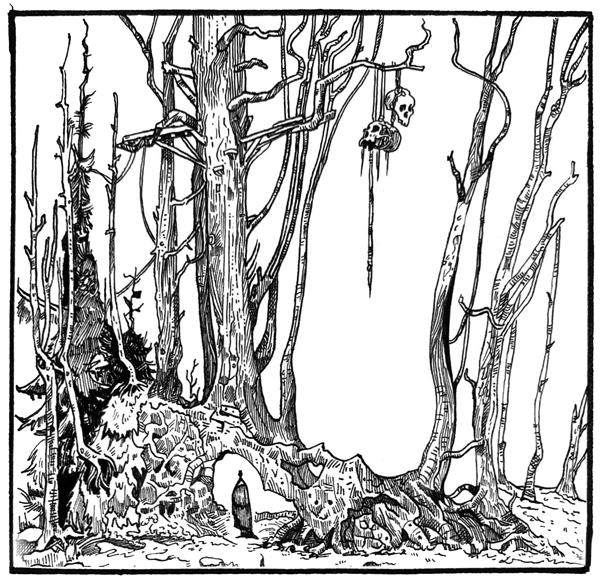 非常、非常突然地,在他居住的高脚木屋外,我赫然看到了高高地悬挂着的头颅骨。