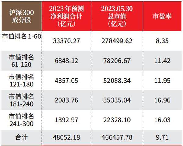 截至05月30日收盘,沪深300指数成分股按总市值除以预测总利润计算的2023年PE平均值为9.71,按照总市值从大到小分为5个区间,同样按照上述方法计算的市盈率平均值分别为8.35、11.42、11.95、16.96、16.03。