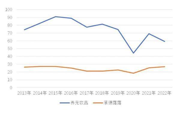 如果我们把视野放得更广阔一些,就会发现养元饮品的营业收入早就增长乏力,而表现落后于承德露露也是从2019年就开始了。2018年,养元饮品的营业收入为承德露露的3.84倍,2019年下降为3.31倍,然而逐年下降至2022年的2.20倍。