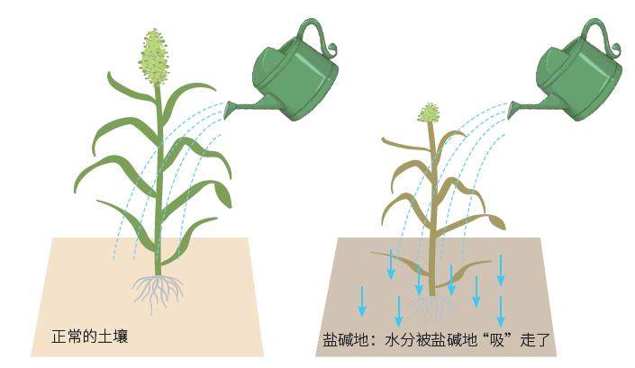 作物生长需要相对稳定和适宜的外界环境,盐碱地高pH值和高渗透土壤环境,会导致作物减产甚至死亡。这是因为,pH值过高会抑制作物对钾、磷、铁等营养元素的吸收,导致作物“营养不良”;高渗透土壤会导致作物无法从土壤中吸收水分。
