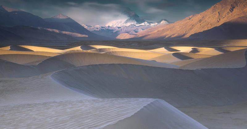 摄影师南卡常年在雪线之上的藏区探索拍摄属于中国西部高原的雪山秘境,上百次进藏拍摄经历,拥有丰富的户外风光摄影经验。此次拍摄的定结沙丘是他在藏地看到最奇特的景观之一,近处是延绵的沙丘,远处雪山伫立。
