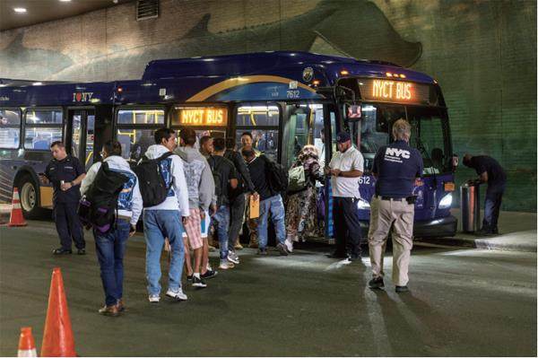 5月14日,美国华盛顿特区,一辆大巴将数十名在得克萨斯州被集中起来的流民,送到了海军天文台。移民下车后,从大巴下面的存储区带走了各式物品,随后消散于夜色中,场面颇为怪异。