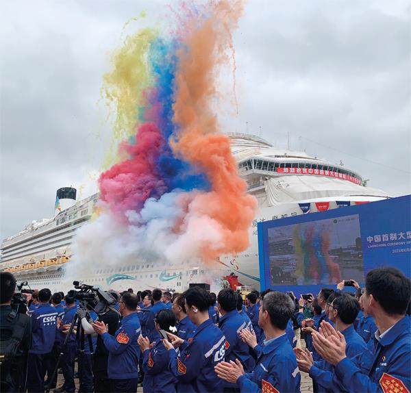 6月6日,由中國船舶外高桥造船有限公司建造的首艘国产大型邮轮“爱达·魔都号”举行出坞仪式,标志着国产大型邮轮项目全面转入码头系泊调试阶段,预计将于本年底完工交付。图/视觉中国
