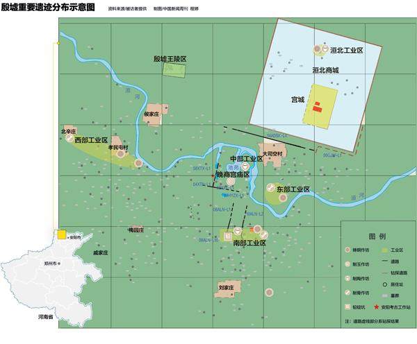 1928年开始的第一阶段殷墟挖掘,主要集中在宫殿区和王陵区。1950年以后,考古队又在宫殿区和王陵区周边发现了一些贵族居住区、作坊区、墓葬区以及城市道路水系。近些年,在传统认知的洹北商城、殷墟区域之外,又有新的重要考古发现。