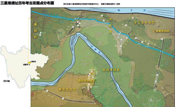 器物坑所在的地方,在很长的时间里都被当地人视为风水宝地。那是一片广袤的田野,势平土沃,利于耕耘,每每庄稼长成时都绿意荡漾。两条自西向东流淌的河流穿行而过,靠北的名为鸭子,靠南的唤作马牧。在马牧河的南北两岸,各有一处突兀而起的土堆,北岸的形似一弯半圆的月亮,因此被称为月亮湾,南岸的则是三个小圆丘,仿佛三颗辰星傍依,故得名三星堆。清嘉庆年间编修的《汉州志·山川志》中,将这里的景致浪漫地描述为“三星伴月”。