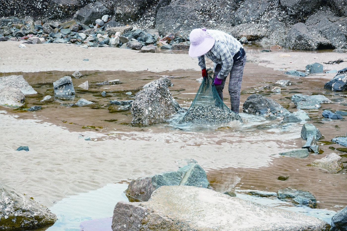 倒是在礁石上挖海蛎、海螺的老人,两三个小时下来多能收获小半桶,回家吃上两碗。