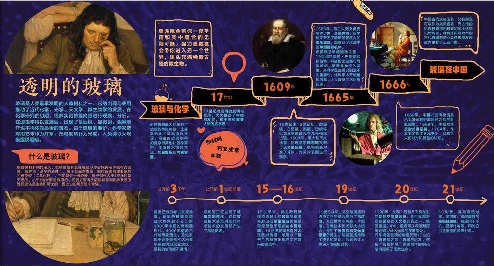 玻璃是人類最早发明的人造材料之一,它的出现与使用推动了近代化学、光学、天文学、微生物学的发展。在化学研究的初期,很多实验依靠肉眼进行观察、分析。在透镜学得以发展后,出现了望远镜、显微镜,眼镜制作也不再依靠昂贵的宝石。由于玻璃的廉价,科学家选择用它来作为灯罩,把电能转化为光能,人类得以大规模摆脱黑暗。