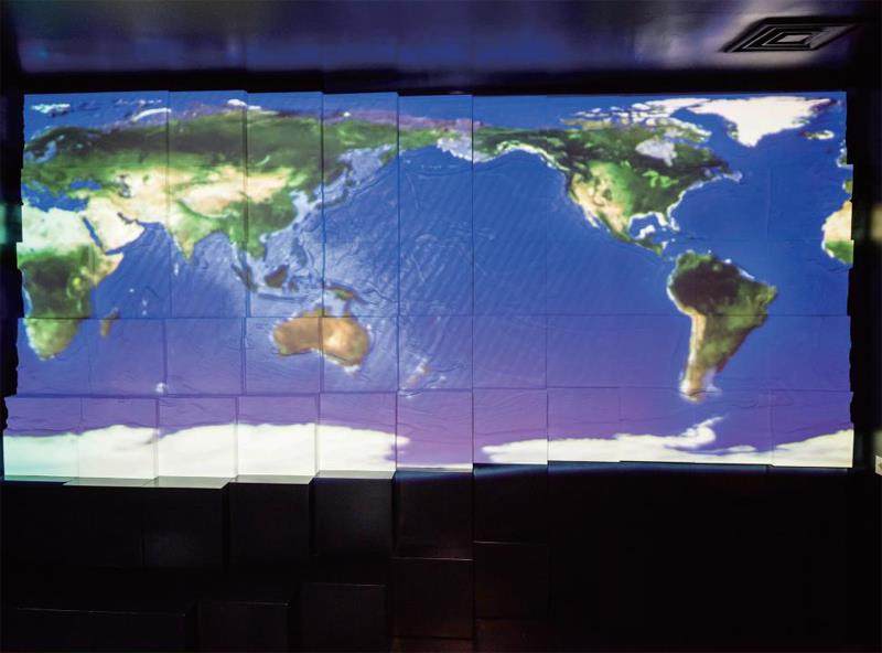 如果把地球上的海水吸干,地球就是另一种面貌。游客穿过门厅,映入眼帘的就是消隐掉海水之后的地球面貌。从亿万年前原始海洋形成的演化模拟,到当今前沿科学深海热液和热液生物的影像,海量的海洋科学知识等你来发现。展厅内呼吸灯忽明忽暗,游客恍若遨游在海洋中的生命体,头顶浅海游鱼,脚踏象征大洋中脊的图画,犹如行走在大洋海底。