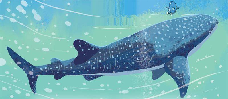 正在小水滴犹豫不决时,远处忽然出现了一个庞大的身影,它的身上密布着白色的斑点和条纹,长着一张扁平巨口。当身影再靠近一些,小水滴很快就认出来了,那是世界上体形最大的鱼——鲸鲨!别看它是鲨鱼,但性格非常温驯,只吃浮游生物和小鱼小虾的。小水滴热情地向它打招呼,没想到鲸鲨先生居然认出了小水滴:“啊……我记得你,小水滴!我们在墨西哥西海岸的下加利福尼亚半岛近海见过面,当时你和一群灰鲸向我问路。怎么样,旅行还顺利吗?”