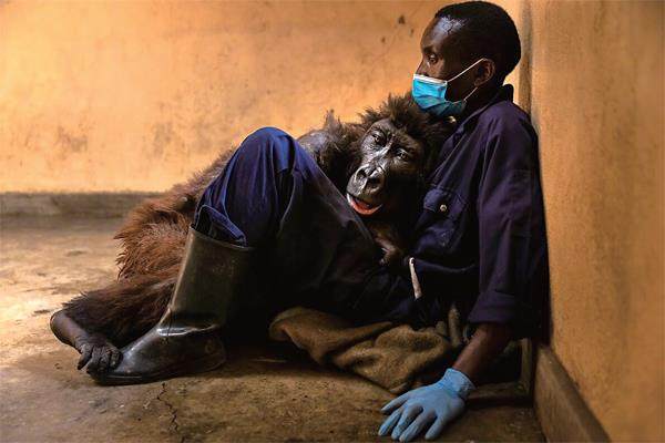 2022年的国际野生动物摄影年赛里,有一张特别的照片:山地大猩猩恩达卡西依偎着看护员安德烈·鲍马,在他的怀里去世了。
